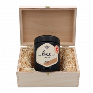 Im Honigsolo «Schweizer Waldaroma» präsentieren wir unseren feinen Schweizer Waldhonig in unserer attraktiven Bee-Family Holzbox.